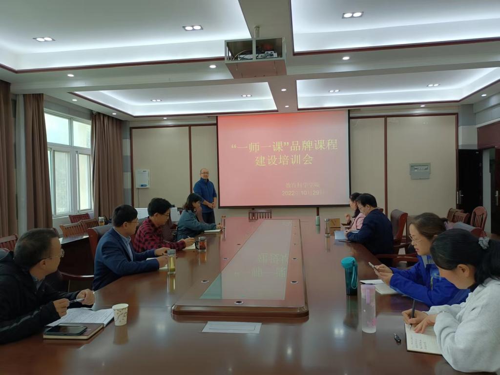 时间:2022-10-31 17:36:45 来源: 作者: 阅读: 次为落实太阳成tyc7111cc“一院一品”工作要求,进一步推动我院“一师一课”品牌课程建设,积极开展课堂教学改革,推动信息技术在课堂教学中的有效应用和深度融合,我院遴选了首批“一师一课”品牌课程10门,并于2022年10月29日在教科楼402会议室举行“一师一课”品牌课程建设培训会,院党委书记房加帅,副院长郭勇、孙天义,专任课教师刘琦、郑雪松、杨建朝、邢思珍、刘萱、马金焕、汪媛媛参加了培训会。培训会由副院长郭勇主持,刘琦老师主讲。