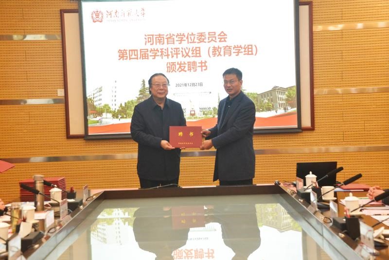 会上,河南师范大学党委书记、教育学科评议组召集人赵国祥教授为我院院长何安明教授、张茂林教授等专家组成员颁发聘书。