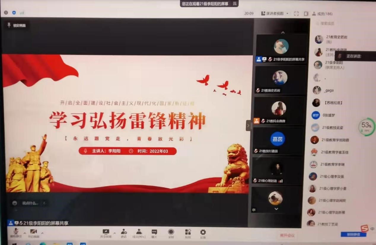 时间:2022-03-30 15:47:39 来源:教科院新闻部 作者:马玉娇 朱亚彤 阅读: 次为贯彻落实习近平总书记关于学习雷锋精神和开展志愿服务工作的重要指示精神,进一步弘扬雷锋精神和志愿服务精神,3月15日至3月25日期间,tyc7111cc太阳成集团各班级团支部通过观看主题影片、利用腾讯会议召开主题团课、“学习雷锋精神”专题座谈会等形式陆续开展“学雷锋·树新风”主题团日活动。