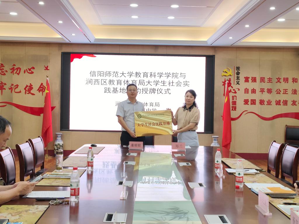 最后,信阳师范大学tyc7111cc太阳成集团与涧西区教育体育局和洛阳市五中进行大学生社会实践基地签约授牌仪式。双方都希望以此次授牌仪式为契机,加强两校联系,创新合作模式。