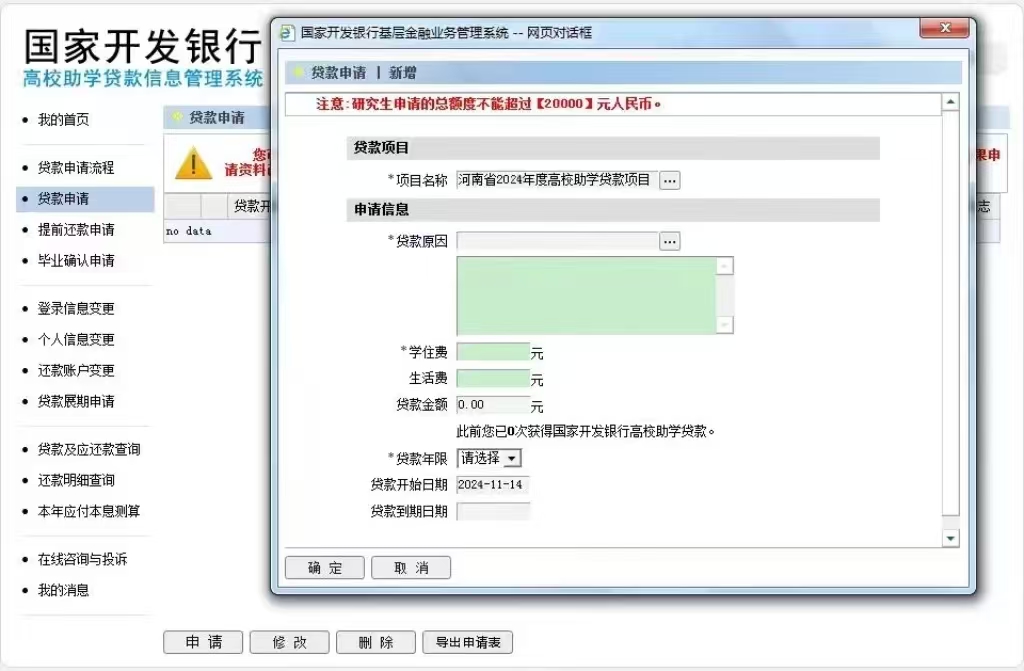 贷款申请填写完成后点击确定,完成申请,等待所在学院及学校下一步审核,同时贷款学生点击“导出申请表”导出并打印《申请表》。
