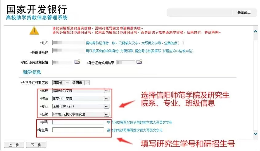 申请者请持身份证填写,避免姓名、身份证号错误,学生姓名要与身份证、高考录取名字一致,如身份证姓名和高考录取名不一致,则不能申请贷款。(学校将进行身份核查,切勿使用他人姓名、身份证号进行注册)