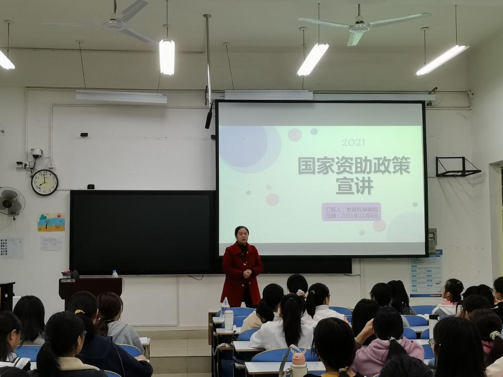时间:2021-11-04 20:53:14 来源:教科院新闻部 作者:马玉娇 刘至涵 阅读: 次11月4日,tyc7111cc太阳成集团2021级新生各班在教科楼108、201、203、204教室分别组织召开新生资助政策宣讲会,班主任张纪娥、吴康、冯靖雯、王蓉以及2021级全体同学参与此次宣讲会。