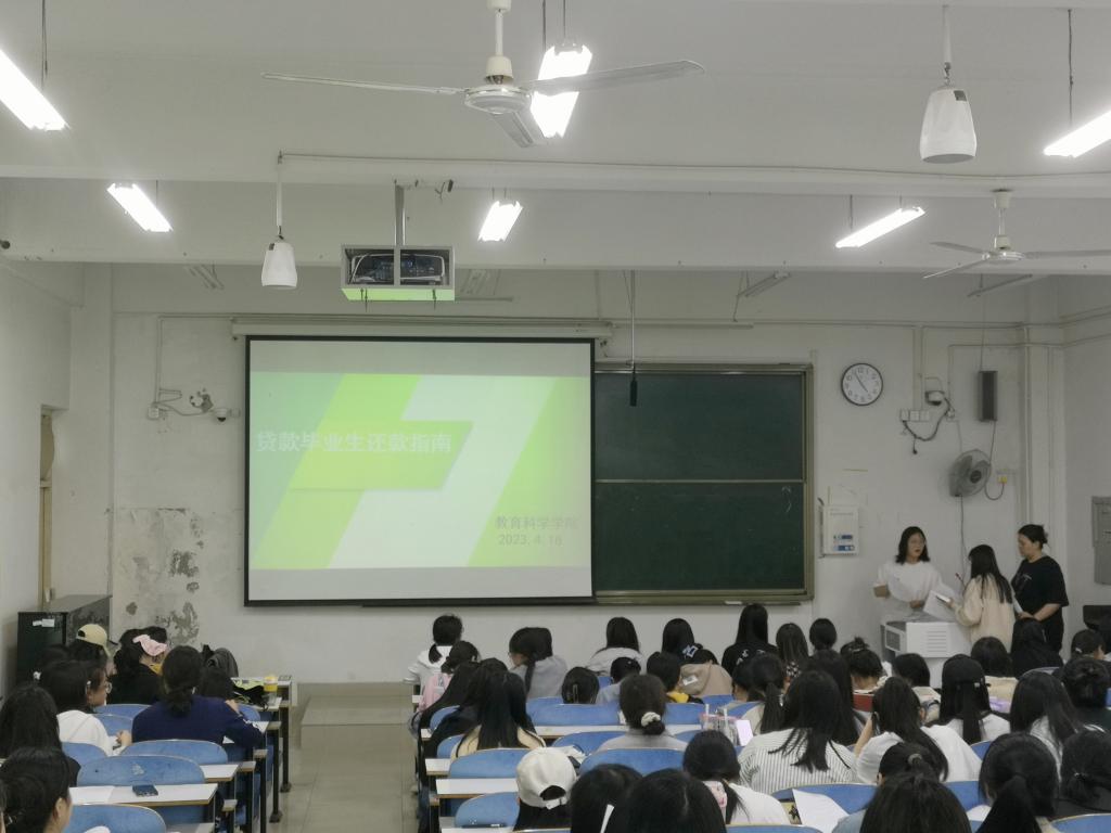时间:2023-04-18 13:12:56 来源:教科院新闻部 作者: 阅读: 次为进一步落实国家助学贷款还款工作,引导学生关注自身信用行为,提高个人诚信意识,4月18日,我院资助专员杨艺卓在教科楼203教室针对2023届贷款毕业生召开诚信还款专题宣讲会。