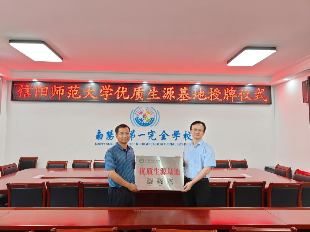 最后,在学校负责人和学院代表的共同努力下,双方签署了《信阳师范大学优质生源基地合作协议书》并举行授牌仪式。