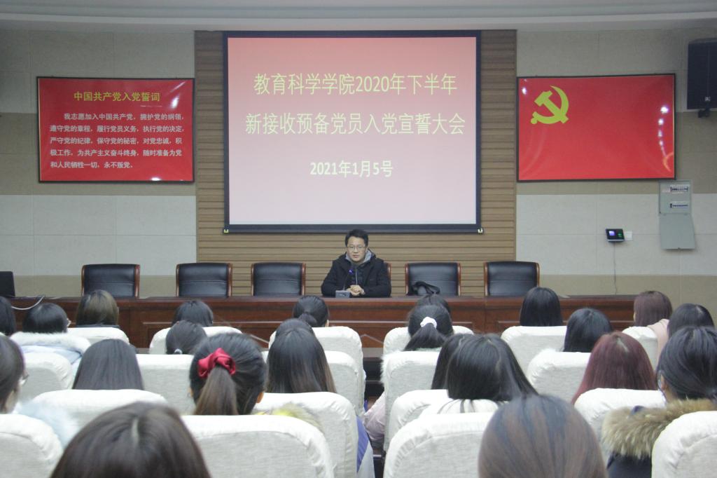 宣誓结束后,教科院党委副书记李贵杰对本次宣誓的学生党员致辞,提出了三个关键词:祝贺、珍惜和希望。他首先祝贺这批学员顺利完成培训和学习任务,成为了光荣的中国共产党党员;其次劝解学生珍视这次机会,在学业和各方面起好党员的模范作用;最后希望全体预备党员能够牢记入党誓词,严格要求自己,在人生路上冲锋陷阵,贡献社会,在为民服务中实现自身价值。