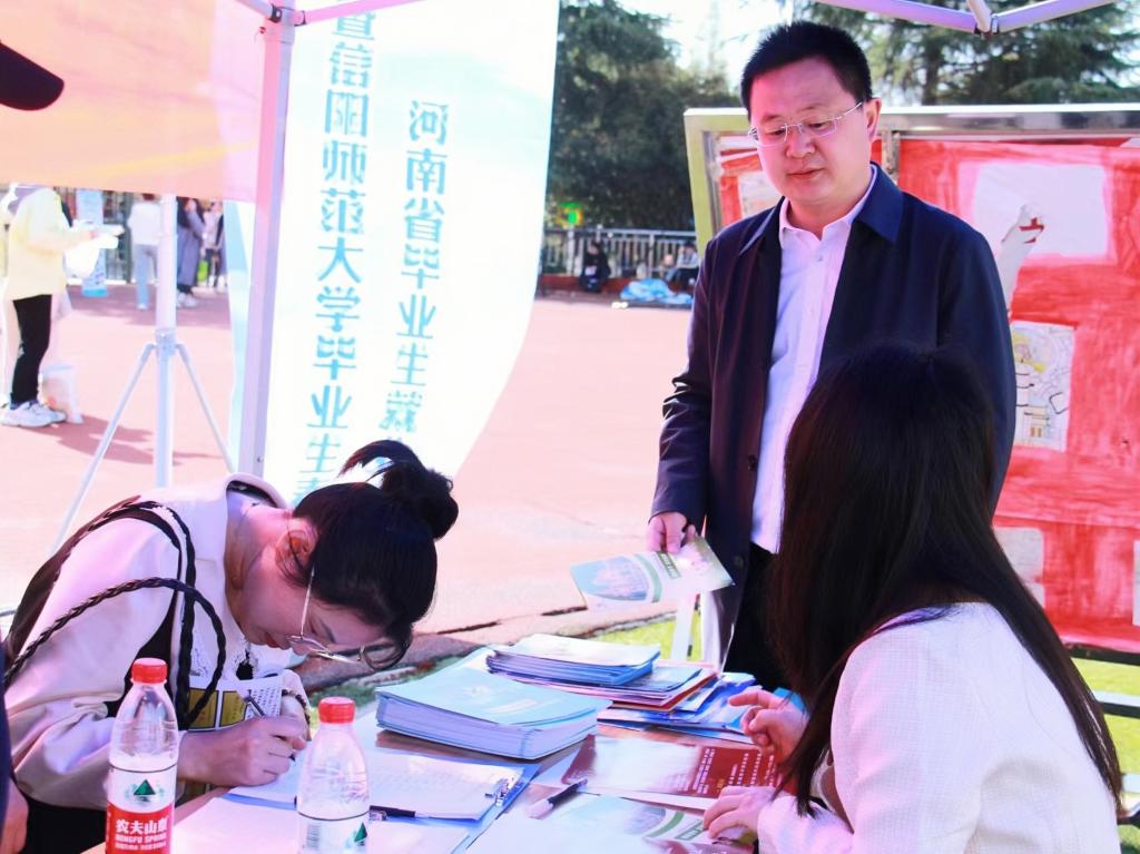 时间:2024-04-02 10:37:28 来源:教科院新闻宣传中心 作者:吴宇熙 祐亚菊 阅读: 次为抢抓春季就业工作关键期,落实做好高校毕业生高质量充分就业工作,3月28日,信阳师范大学2024届春季校园双选会在西操举行,我院积极组织2024届毕业生参加此次双选会。tyc7111cc太阳成集团党委副书记董银银以及毕业班班主任前往双选会现场,与用人单位热切交流并指导2024届毕业生求职。