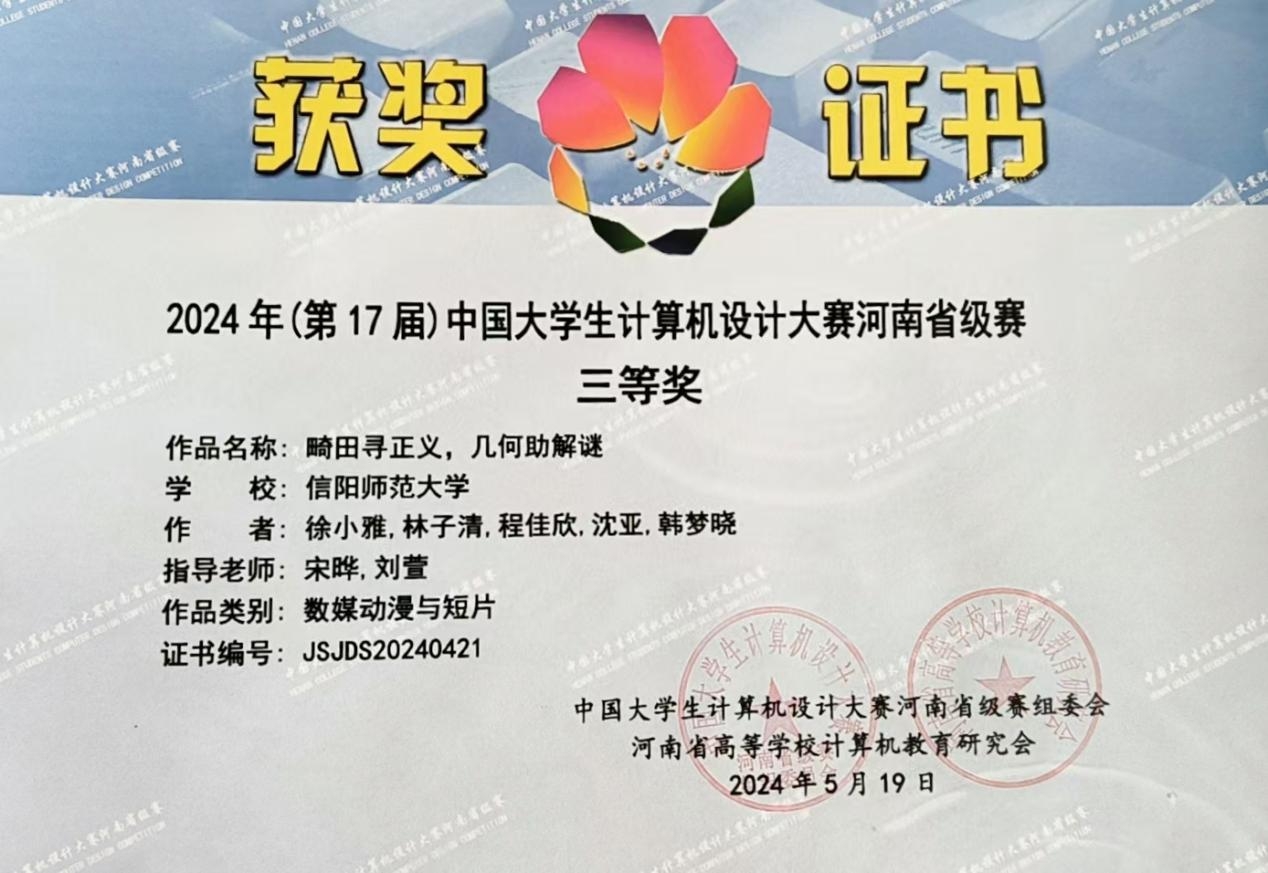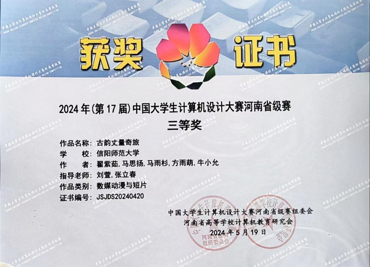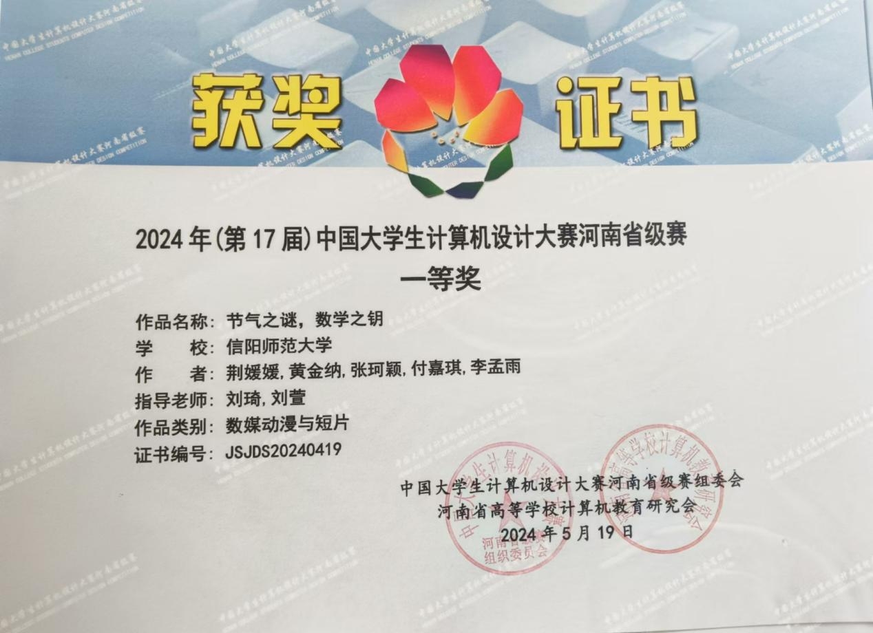 中国大学生计算机设计大赛由教育部与计算机教指委组织联合主办,已经连续举办了17届赛事,现为全国普通高校学科竞赛排行榜的榜单赛事之一。本次大赛采用校级初赛——省级复赛——国家级决赛三级竞赛形式,省级赛事中采用线下作品展示、汇报和答辩相结合的比赛方式。本次大赛共有来自省内49所高校和12所高职院校的833件作品,刘琦、刘萱老师指导的《节气之谜,数学之钥》获数媒动漫作品普通组一等奖,宋晔、刘萱老师指导的《畸田寻正义,几何助解谜》、刘萱、张立春老师指导《古韵丈量奇旅》获得省赛三等奖。《节气之谜,数学之钥》被省赛组委会推荐参加国家级第17届中国大学生计算机设计决赛。