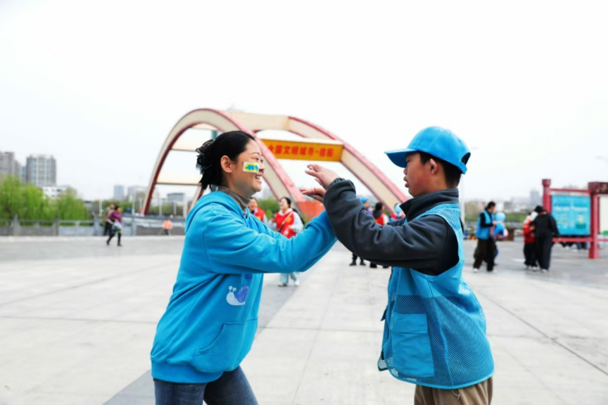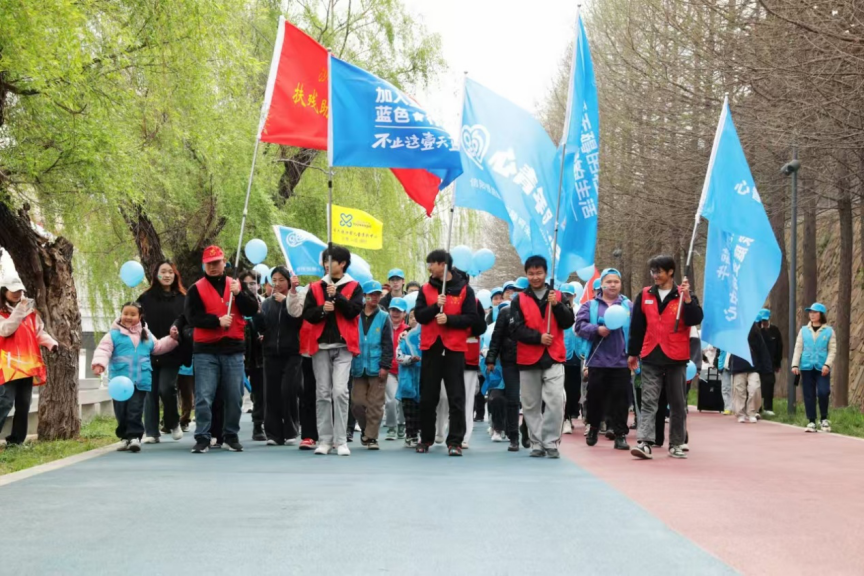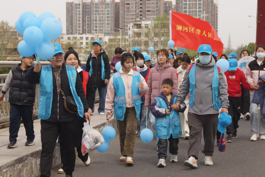 活动前,我院党委副书记缑星、专业教师朱欲晓对活动志愿者进行培训。活动当天,参与者身着蓝色马甲,象征着对孤独症团体的关爱与支持。志愿者们早早来到集合地点,脸上洋溢着热情的笑容与孩子及家长互动。上午9点整,徒步活动正式开始,大家高举写着“有爱无碍、自主自在”等标语的旗帜,从茶韵广场出发,沿浉河南部滨河步道有序进行。4.2公里的路程,志愿者拉着小朋友的手一路耐心陪伴、细心呵护。沿途的风景与温暖的互动,让孩子们的脸上渐渐绽放纯真的笑容。徒步过程中志愿者和孤独症家庭一同探访友好商户,这些友好商户早早挂上了特制的友好挂牌,通过与社区的活动进一步增强孤独症儿童的社会参与。