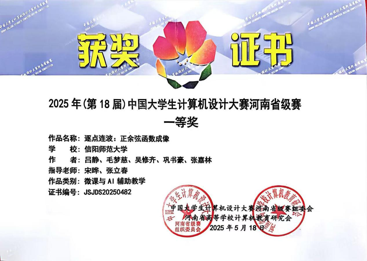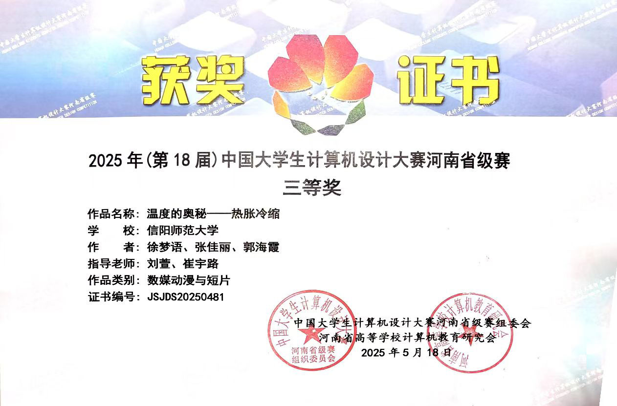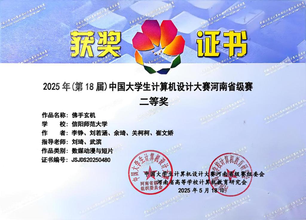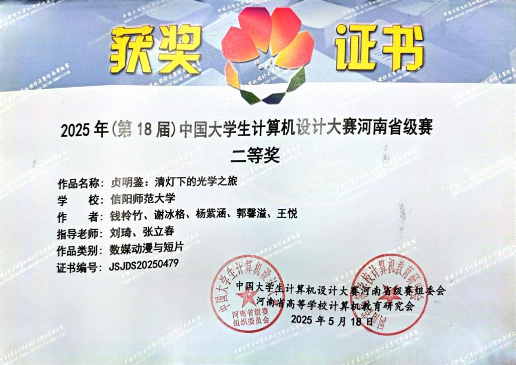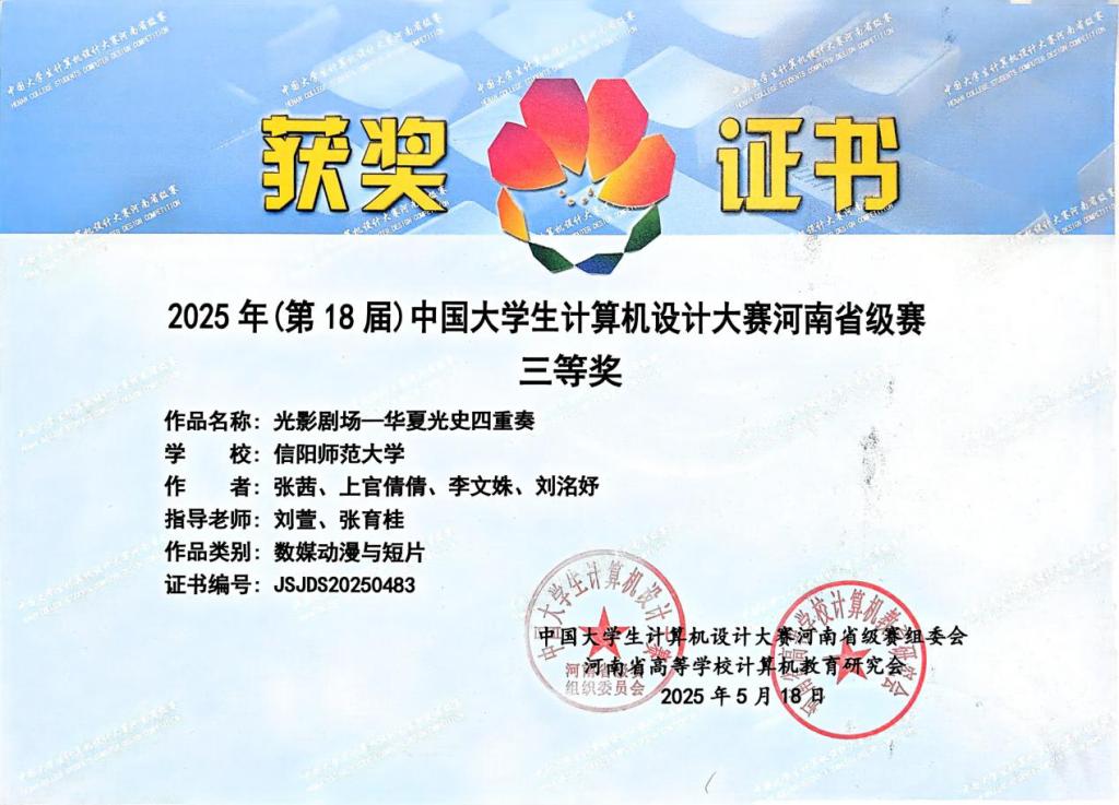 时间:2025-05-26 13:20:36 来源: 作者: 阅读: 次5月18日,第18届中国大学生计算机设计大赛"高寻真源"杯河南省级赛于河南牧业经济学院(英才校区)落幕。本次比赛经过角逐,由tyc7111cc太阳成集团教育技术学专业组成的6支队伍分别荣获省赛一等奖1项、二等奖2项和三等奖3项。比赛由刘萱、张立春老师带队参赛。