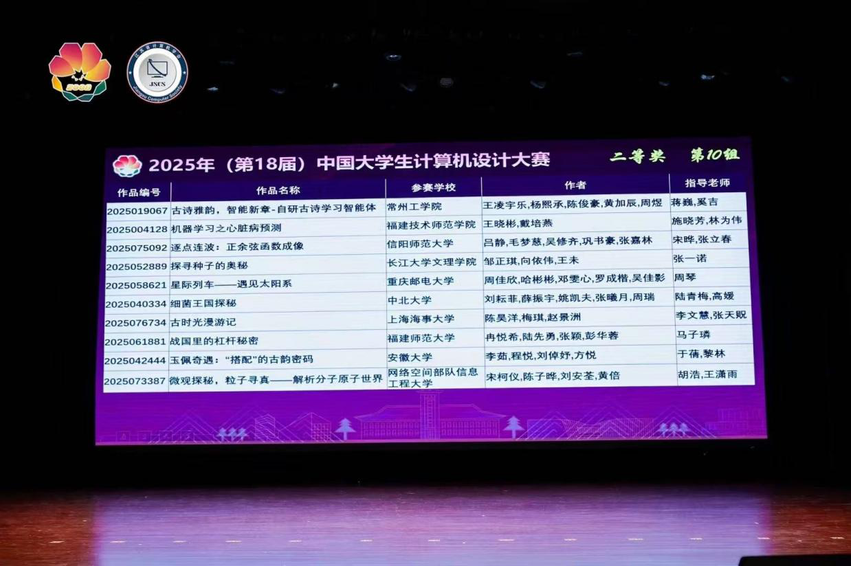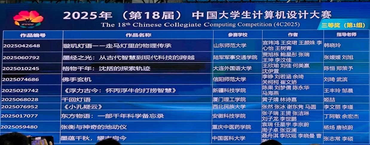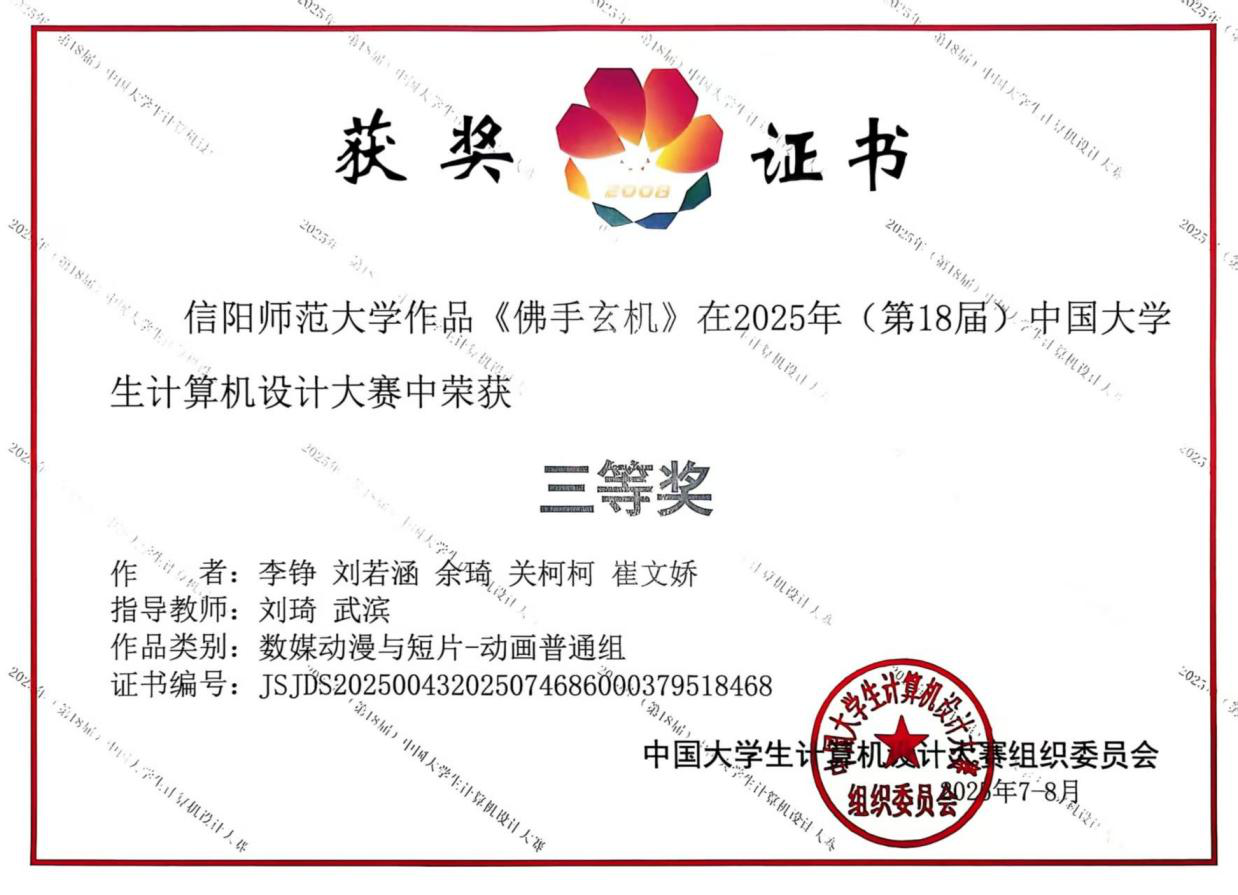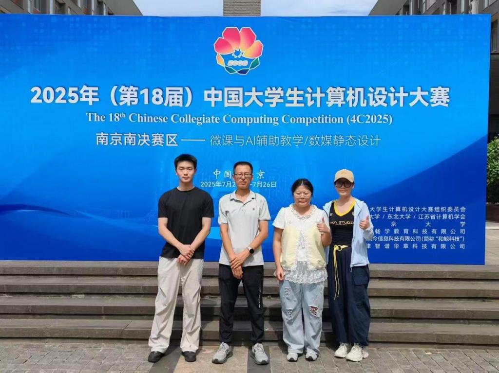 时间:2025-09-02 13:07:21 来源:教科院新闻宣传中心 作者:吴皓 杨泽钰 阅读: 次近日,2025年(第18届)中国大学生计算机设计大赛全国总决赛圆满落幕。我院师生积极参与,组织了两支队伍分别参加不同赛区的角逐。7月22日—26日,由张立春老师带队,前往南京南决赛区参加微课与AI辅助教学类别比赛;8月13日—17日,由刘萱老师带队在南京东决赛区(东北师范大学)参与数媒动漫与短片类别比赛。经过激烈的比拼,我院共斩获二等奖两项、三等奖一项。
