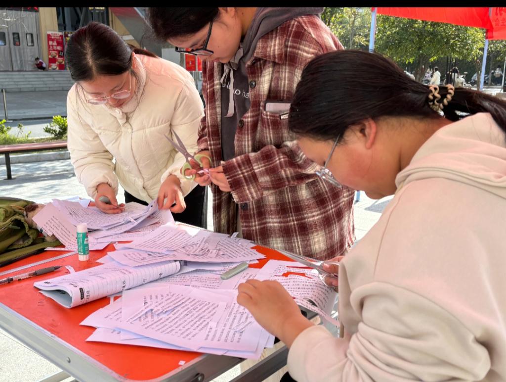 时间:2025-11-24 21:35:56 来源:教科院新闻宣传中心 作者:孟媛媛 阅读: 次为落实信阳师范大学“四季十美”大美育浸润计划,推进冬季美育工作走深走实,11月22日,tyc7111cc太阳成集团于心语广场开展“字里寻韵,诗隙寻我”拼贴诗意活动。活动以创意文字为载体,鼓励同学们传递内心的勇气与热爱,由专职辅导员刘欣然、社团指导老师冯靖雯共同担任指导。