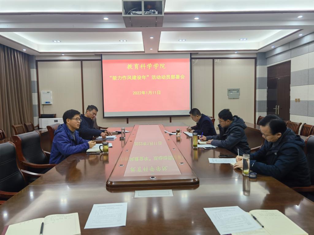 时间:2022-01-12 10:31:07 来源: 作者:张纪娥 阅读: 次为贯彻落实省委、省高校工委和学校党委关于开展“能力作风建设年”活动要求,1月11日下午,教科院采取线下线上相结合的方式召开“能力作风建设年”活动动员部署大会,学院领导班子成员、部分科级干部和行政管理人员在教科楼303会议室参会,其余教职工线上参加。会议由党委副书记董银银主持。