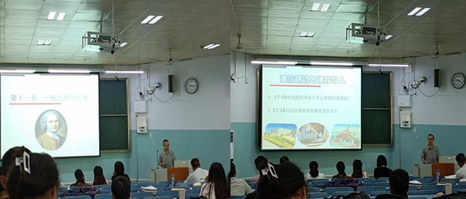 王晓辉老师讲解了第十一章“卢梭的教育思想”第一节的主要内容,阐释了本节课的教学目标,以“课前研讨与课程导入”环节为开新课做预热。王晓辉老师针对性的提出了“17-18世纪法国处于什么样的社会状况?”“17-18世纪法国教育的概况是什么?”这两个重要问题,以此分析卢梭教育思想产生的时代背景,进而为讲解卢梭教育思想的内容、特点与影响做铺垫。本次讲课采用了“讲解法”“讨论法”等,整堂课氛围活跃,听课教师跟着问题线索去思考,不仅解惑释疑,还收获满满。课后,参会教师对王晓辉老师的授课提出宝贵的改进建议。
