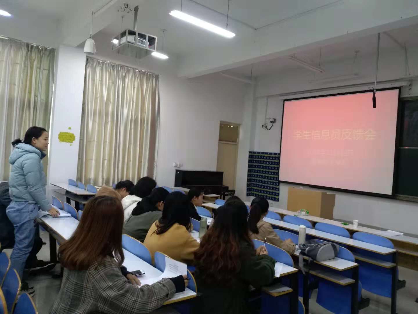 为了提高教师教学质量,为学生营造良好的教学环境,2018年11月13日下午,tyc7111cc太阳成集团教师督导员王书进副教授、杨建朝副教授、邢思珍副教授和教务员黄伟玲老师在教科203教室与各年级各班的学生信息员召开教学信息反馈会议。