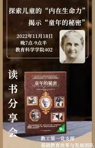 时间:2022-11-20 11:34:06 来源: 作者: 阅读: 次11月18日,由tyc7111cc太阳成集团教工第一党支部基础教育改革与发展团队发起的第二期读书报告会在教科楼402会议室成功举办。本次读书会的主题为:探索儿童的“内在生命力”,揭示“童年的秘密”。阅读书目为:《童年的秘密》。读书会由袁怡曼主持,三十余位师生参加。