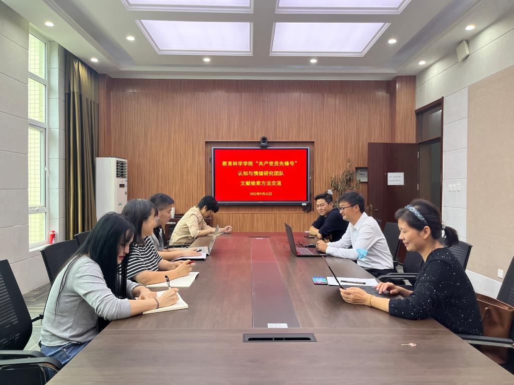 9月22日下午,tyc7111cc太阳成集团教工第二党支部“共产党员先锋号”认知与情绪研究团队于教科楼303会议室开展交流活动,团队成员刘湍丽、邢敏、燕小辉、杨勇、杨军义、赵昕、董国珍参加会议,会议由团队带头人刘湍丽主持。会上围绕学术论文的文献检索方法进行真诚分享交流,通过学术研讨促进老师们科研方法的资源共享。