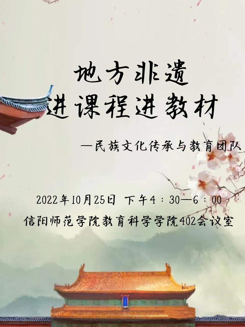 时间:2022-10-26 09:43:24 来源: 作者: 阅读: 次为了响应院党委号召,扎实推进党对教育工作的领导和引领,“共产党员先锋号”民族文化传承与教育团队于10月25日下午在教科楼402会议室成功举办“地方非遗进课程进教材”学术研讨会,研讨会由中共党员郑雪松教授主持。